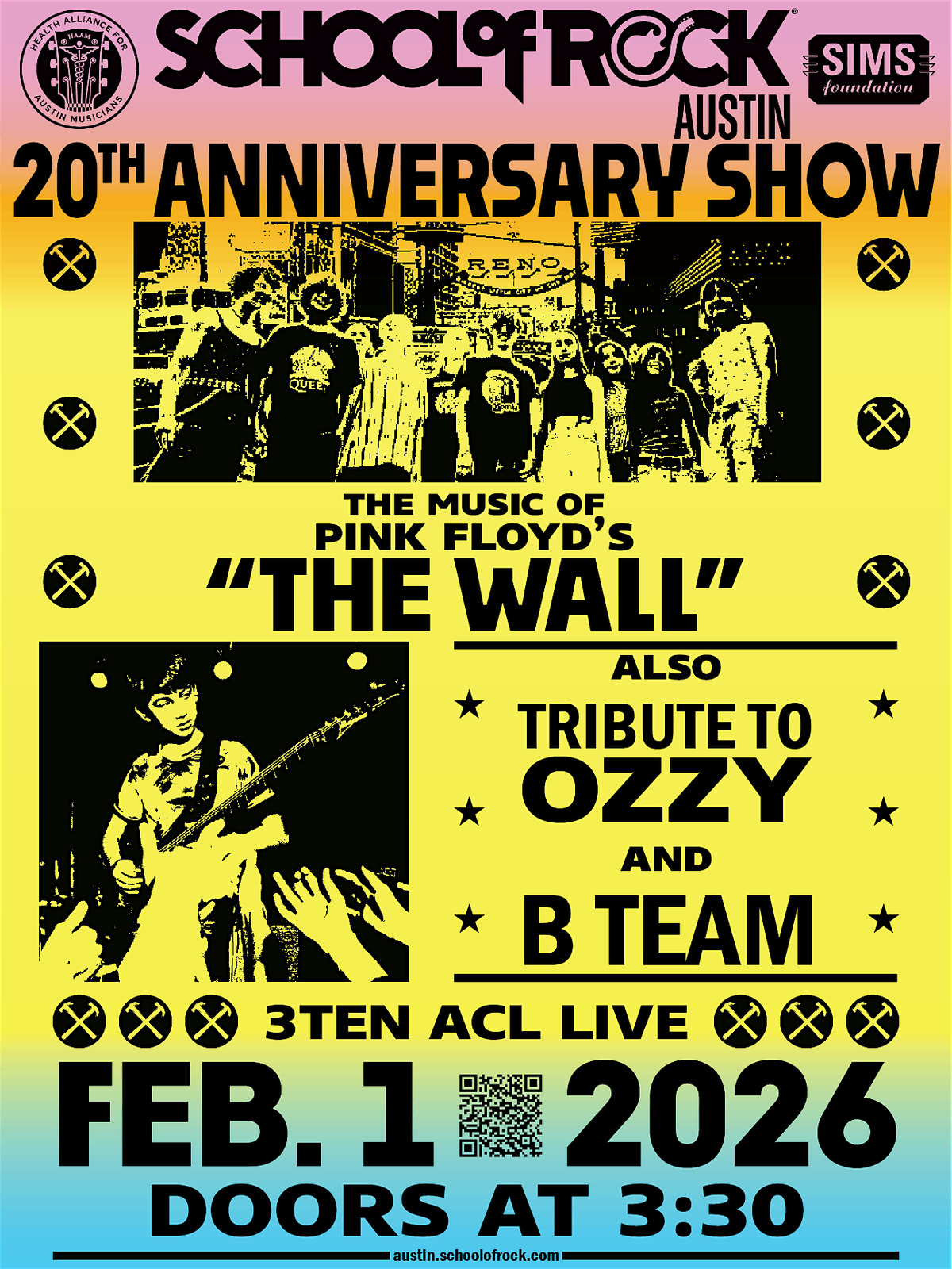 Celebrate 20 years of School of Rock Austin on Sunday, February 1st, starting at 3:30pm at 3TEN Austin City Limits! Enjoy an epic lineup featuring our Tribute to Ozzy, see our Performance Program kids perform Pink Floyd's The Wall in its entirety, and a powerful performance by our Houseband. We'll also be handing out some special awards, plus a few door prizes to keep the celebration rocking.