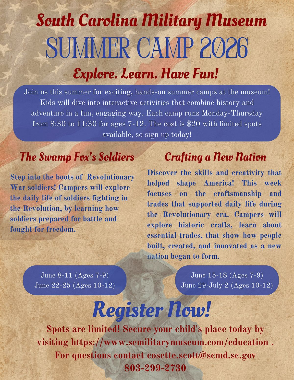 This summer, the SC Military Museum is celebrating the 250th anniversary of the Revolutionary War by offering two unique and engaging camps for kids! Running through June, each camp will take place Monday through Thursday for approximately 3 hours per day from 8:30-11:30 A.M. There are two separate sessions for each camp The Swamp Fox's Soldiers and Crafting a New Nation . Session 1 is for ages 7-9 and Session 2 is for ages 10-12. Session 1 camps run June 8-11 and June 15-18. Session 2 camps run June 22-25 and June 29- July 2. The cost for each camp is $20 per person. Our camps provide hands-on learning experiences that connect history, science, and practical skills in a fun and interactive environment.