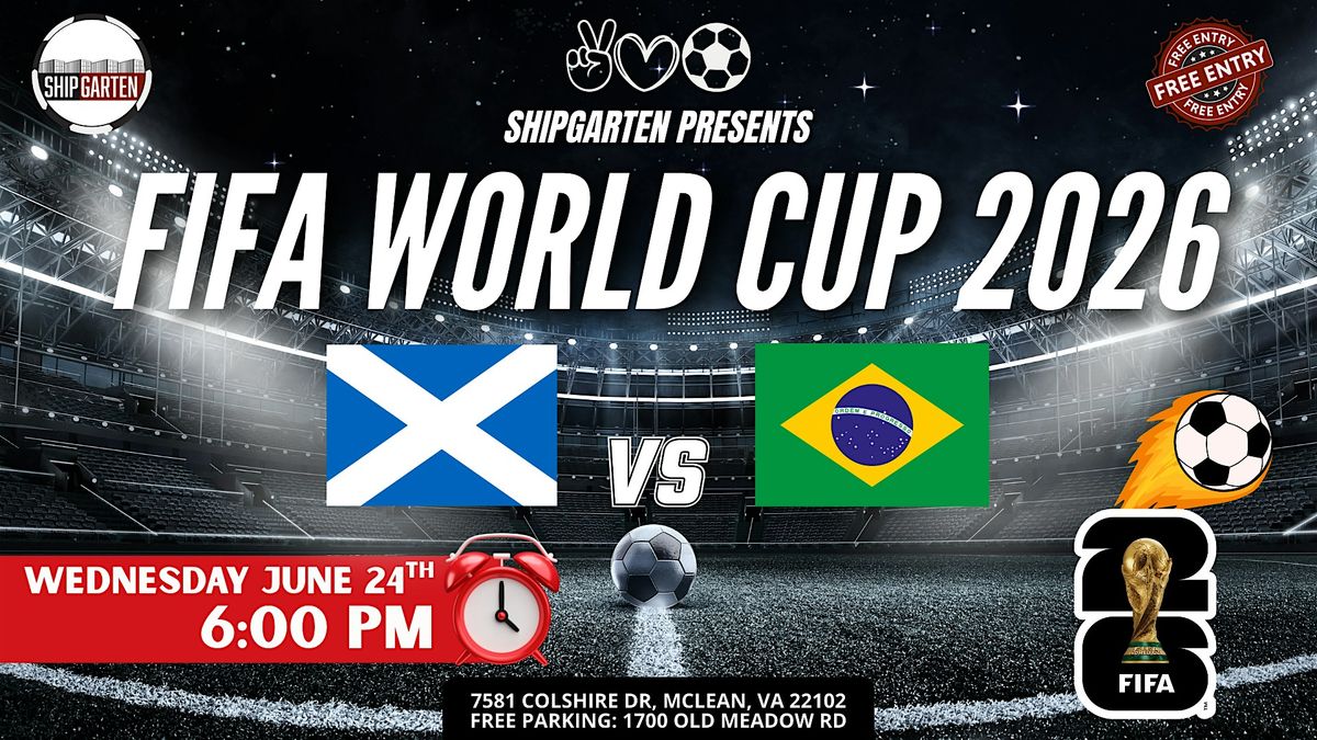 MIDWEEK CLASH. PASSION VS POWER. Scotland brings heart, grit, and fearless fight. Brazil brings flair, rhythm, and world-class magic. 6PM kickoff. After-work energy turns into full matchday chaos. Shipgarten becomes the biggest World Cup watch party in Tysons. THIS IS HOW YOU WATCH A WEDNESDAY MATCH You clock out. You grab a cold one. You don’t miss kickoff. Massive screens & stadium-level sound $40 Mix & Match Beer Buckets (5 – 16oz cans) 100+ beer varieties available All ages welcome (21+ to drink) The most energetic World Cup crowd in Tysons This isn’t background TV.This is full stadium energy. TRADITION MEETS SAMBA Scotland’s pride and pressure. Brazil’s creativity and attacking firepower. 6PM means the crowd builds fast. Goals hit harder at night. Come early. Stay loud. Celebrate big. GAME DAY DETAILS Wednesday, June 24th Kickoff: 6:00 PMShipgarten – 7581 Colshire Dr, McLean, VA 22102 FREE & large parking at 1700 Old Meadow Rd FREE ENTRY – Pay only for what you consume Coming with your crew? Upgrade your match day. More Info Click Here The biggest crowd. The coldest beer. The loudest World Cup in Tysons.