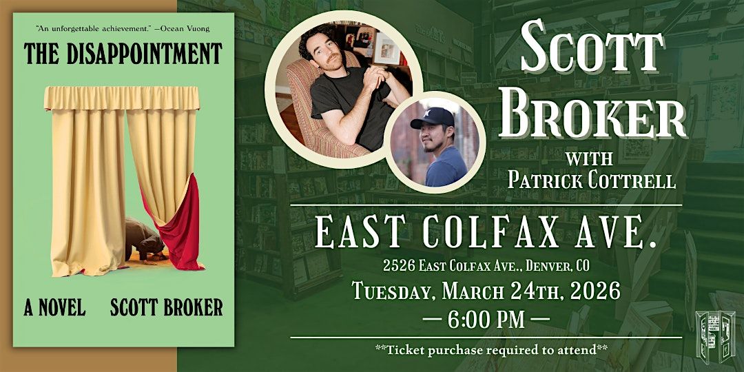 Join us as we celebrate queer writer, bookseller, and teacher Scott Broker's new novel, The Disappointment on Tuesday, March 24th at 6:00 PM at our Colfax location.