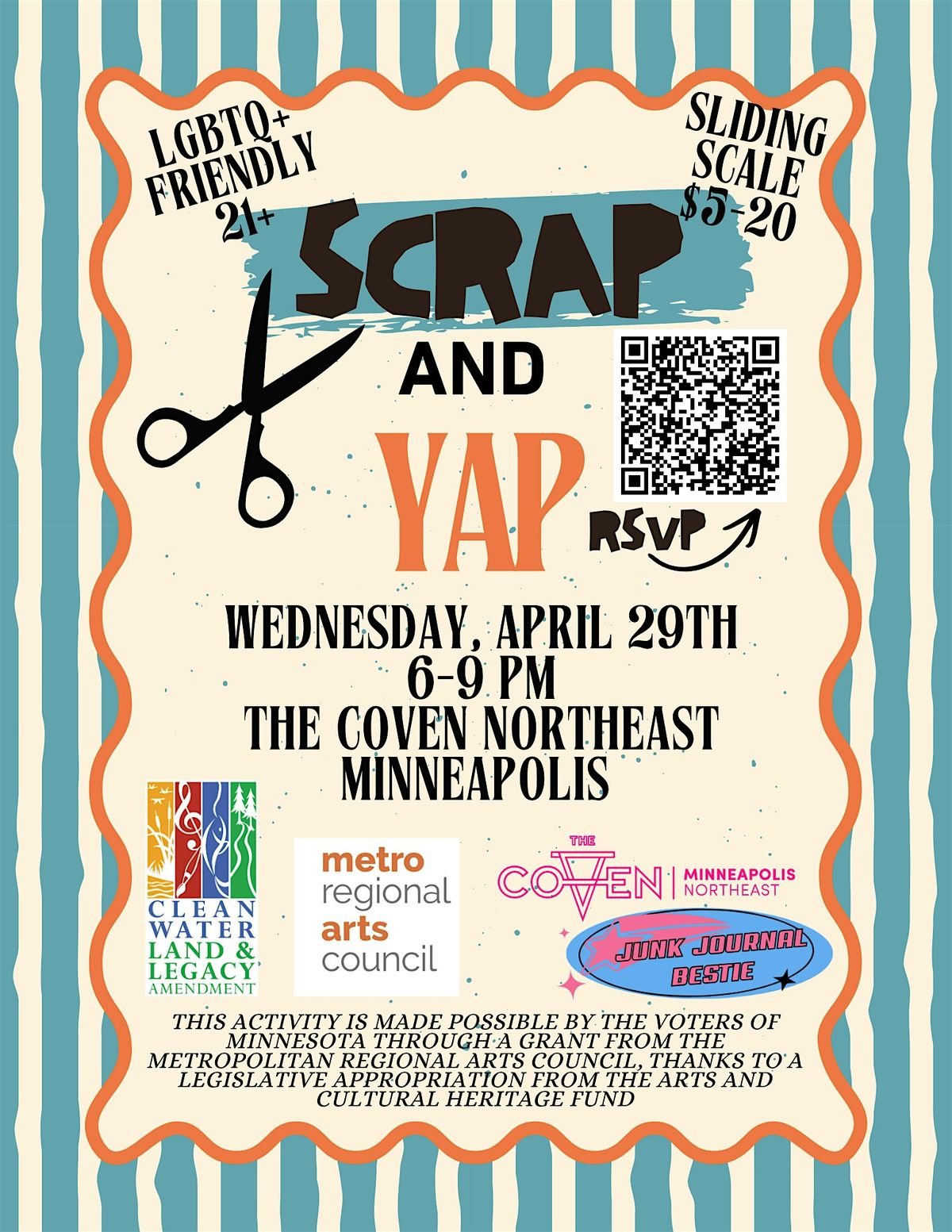 Scrap and Yap tickets are offered on a sliding scale, so you can choose whatever feels comfortable for you. I’ll also be holding aside a limited number of free spots because accessibility is important. If you’d like one, please message me as soon as you can. No explanation needed! Free spots will be first come first serve.This activity is made possible by the voters of Minnesota through a grant from the Metropolitan Regional Arts Council, thanks to a legislative appropriation from the arts and cultural heritage fund.