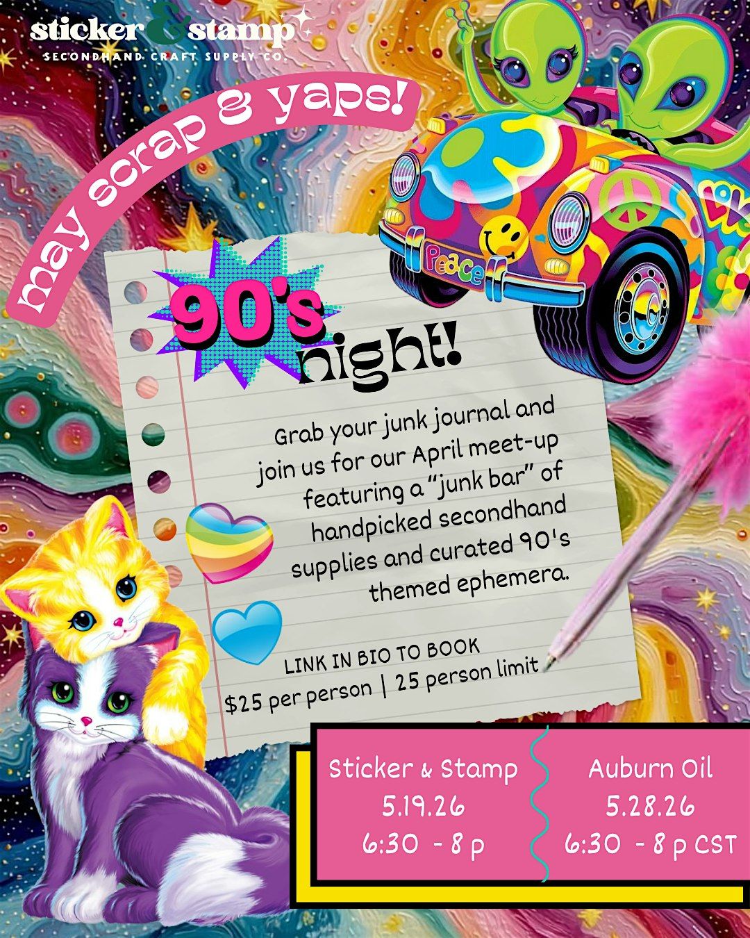 - Access to our junk bar: your pick of our collection of entirely vintage and secondhand ephemera, scrapbook paper, stickers, stamps, etc. New items every month! May is all 90's inspired! Feel free to dress up!