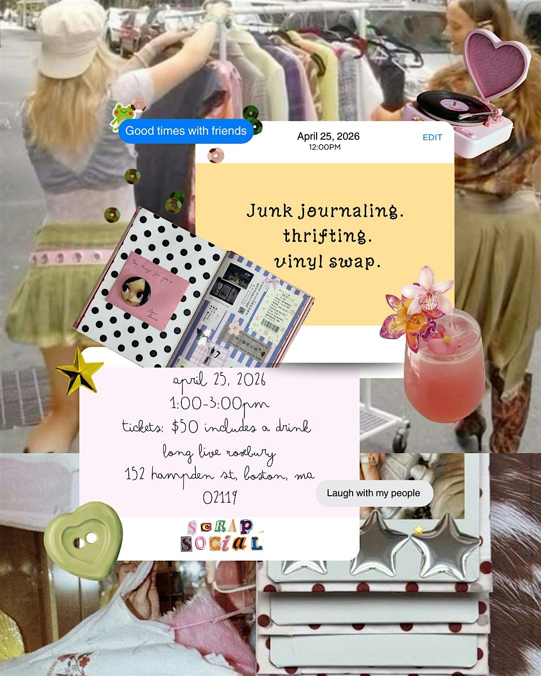 Come join us for a fun-filled junk journaling afternoon at the ScrapSocial event! This is more than just junkjournaling, it’s a moment to pour into yourself, celebrate friendship, and exist in a room full of softness and creativity. Whether you come with friends or arrive solo, you’ll leave feeling inspired, connected, and full in every way.