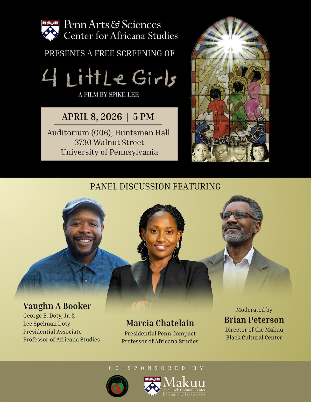 The Center for Africana Studies at Penn presents a free screening of 4 Little Girls, an important film by Spike Lee that documents the notorious 1963 racial terrorist bombing of the 16th Street Baptist Church in Birmingham during the Civil Rights Movement, which took the lives of four young African-American girls. The film provides a deep and impactful exploration of all the people and events surrounding the tragedy. This event will feature a panel discussion featuring Africana Studies professors Vaughn A. Booker and Marcia Chatelain, moderated by Brian Peterson, director of the Makuu Black Cultural Center.
