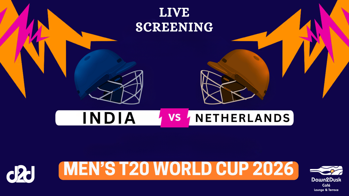 India vs Netherlands – T20 World Cup LIVE Screening 🇮🇳🔥Get ready for an electrifying T20 World Cup clash as India takes on Netherlands, streaming LIVE at Dawn2dusk Café — the biggest rooftop café in the city with the largest screening experience!Feel every six, every wicket, and every cheer on our massive giant screen, under the open sky, with an unbeatable rooftop ambience, delicious food, refreshing drinks, and high-energy crowd vibes.Whether you’re coming with friends, family, or your cricket squad, Dawn2dusk is the ultimate rooftop destination to support Team India and experience the World Cup like never before.