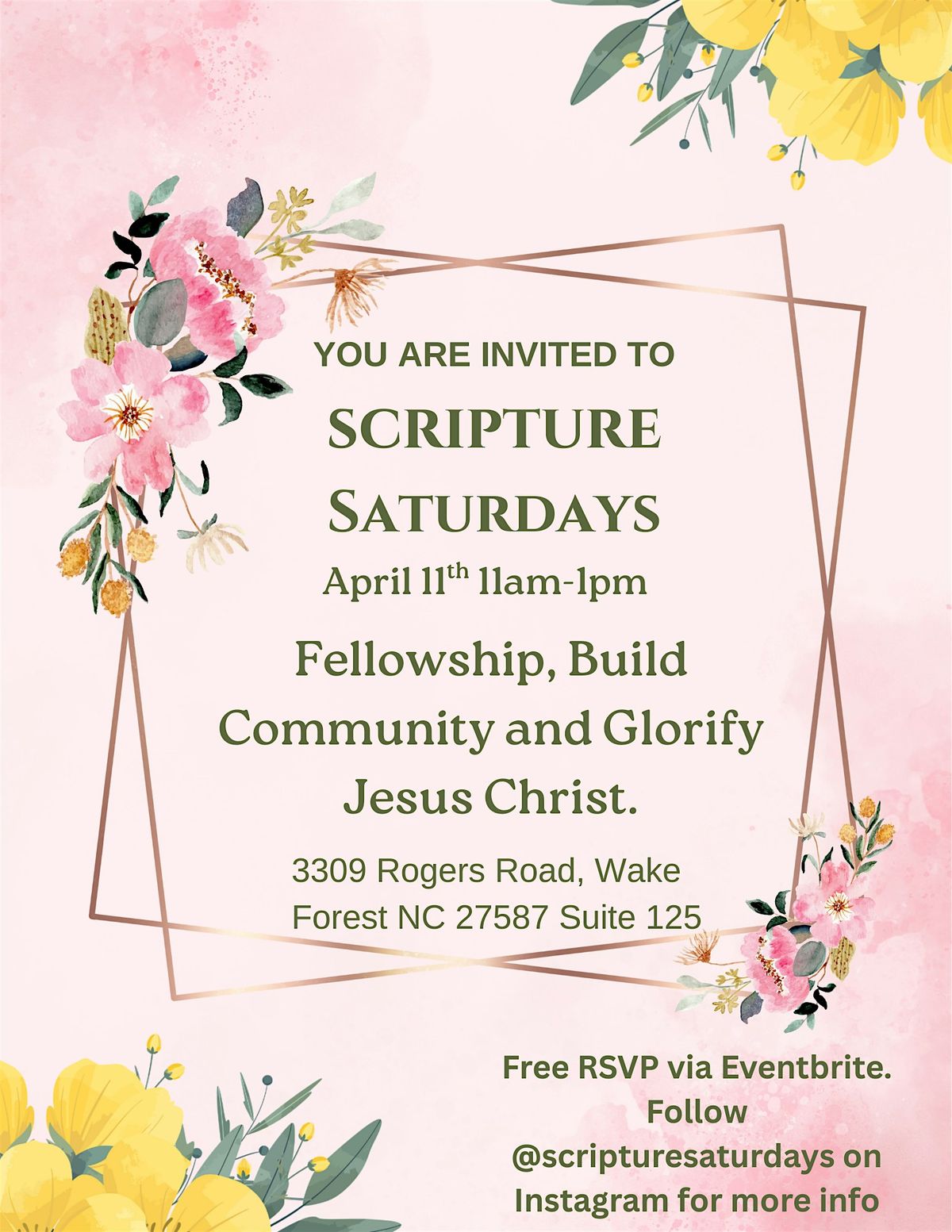 Welcome to Scripture Saturdays! Join us at 3309 Rogers Road, Wake Forest NC 27587 Suite 125 on April 11th at 11:00 AM for fellowship and building Christ centered community. Let's dive into the Word together and strengthen our faith. Don't miss this opportunity to connect with like-minded individuals, do some Bible trivia.