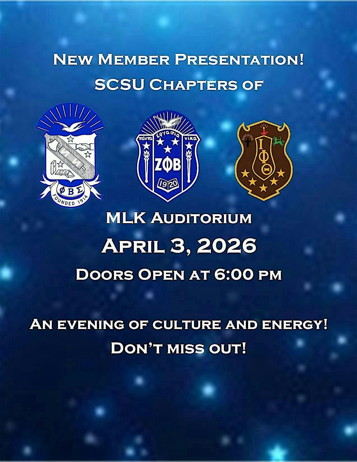 Get ready to celebrate with ΖΦΒ, ΦΒΣ, and ΙΦΘ as they present their new members! Join us at the MLK Auditorium on April 3, 2026 at 6:00 PM (Eastern Time) for an exciting evening full of energy and fellowship. Don’t miss out on this awesome chance to support and meet the newest members of these amazing organizations. See you there!