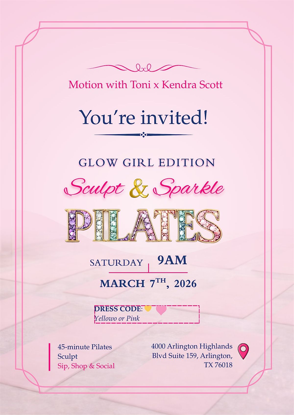 Join us for a guided mat Pilates class hosted inside Kendra Scott, followed by a private shopping experience where attendees will receive an exclusive 15% discount on in-store purchases.
