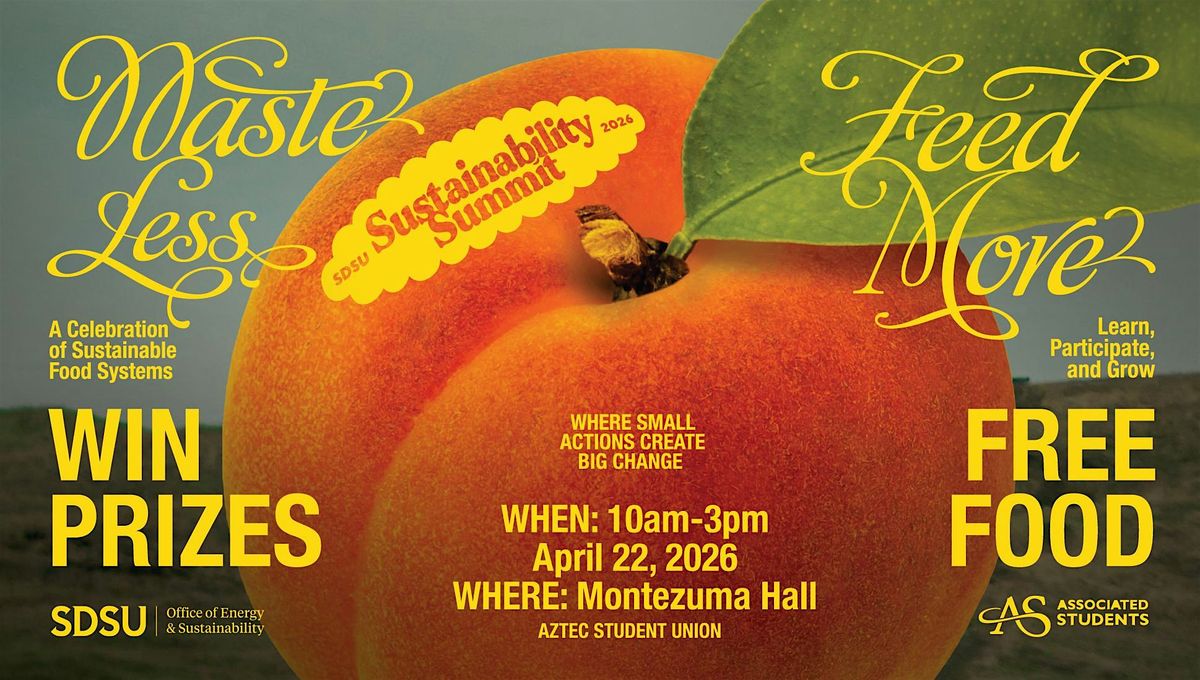 Join us for the 4th Annual SDSU Sustainability Summit, a one-of-a-kind event dedicated to exploring and promoting sustainable practices. There will be free food and giveaways! This in-person summit will be held at Montezuma Hall in the Conrad Prebys Aztec Student Union, where students, staff, faculty, alumni and community members will gather to learn about food security, food waste and climate action. Lunch will be offered during a lunch and learn session with an opportunity to engage directly with campus partners and organizations to learn more about specific initiatives at SDSU. This will be a zero-waste event with gluten-free and vegan food options available. Attend the full day or a few sessions as your time allows.