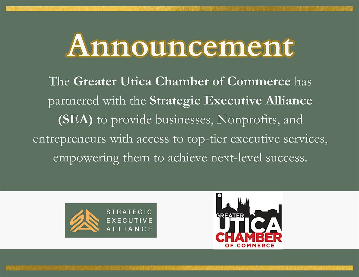 The Greater Utica Chamber of Commerce and Strategic Executive Alliance (SEA) have partnered to bring monthly SEA executive office hours to local businesses, nonprofits, and entrepreneurs.Starting Monday, April 7, 2025, SEA experts will be on-site at the Chamber every first Monday of the month from 10:30 AM – 4:30 PM, empowering the Utica business community by offering hands-on support and strategic guidance.💡 Looking for high-level executive expertise without the full-time cost? Book your spot now and register.