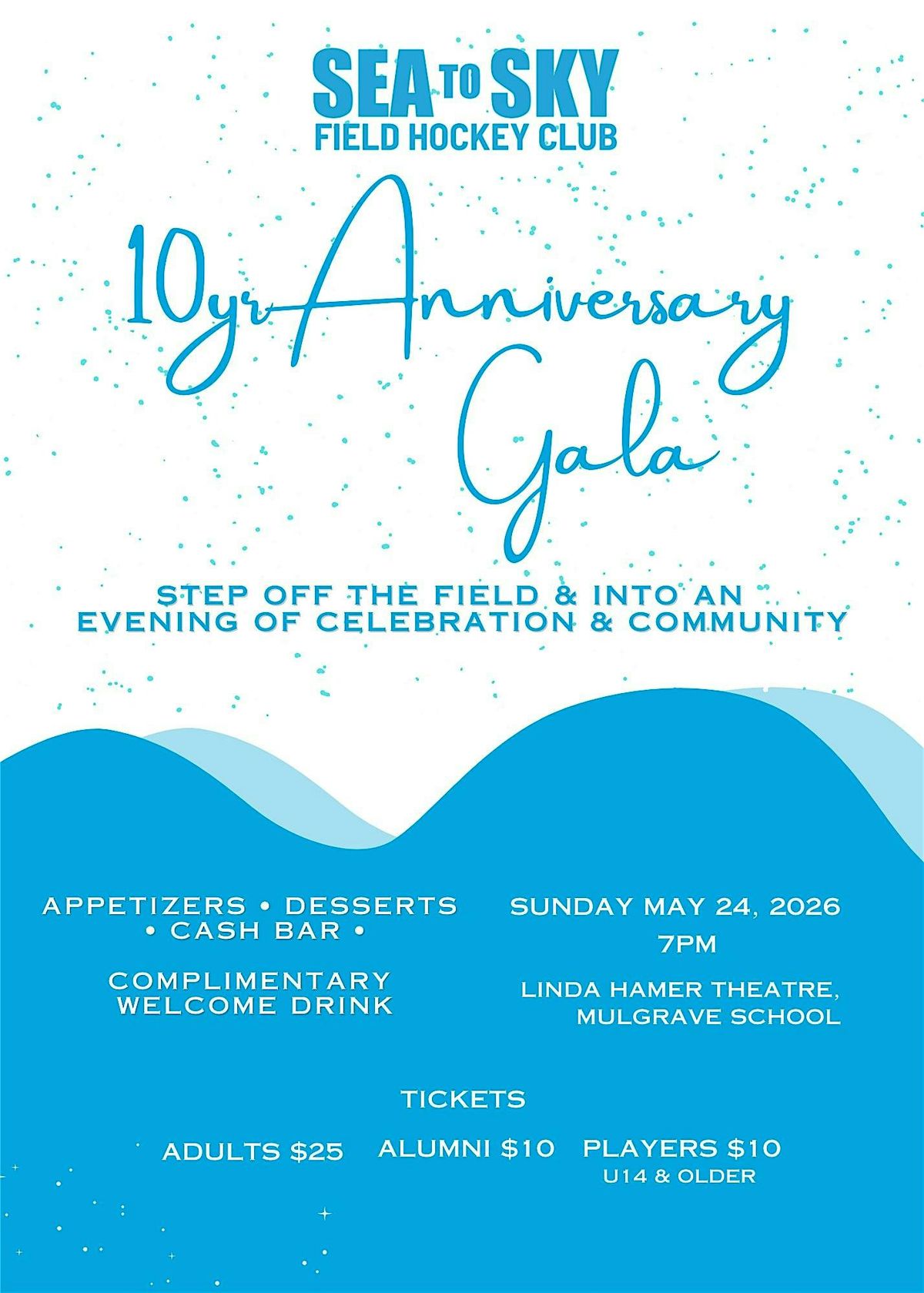 Join us off the field in the Linda Hamer Theatre at Mulgrave School. We'll celebrate a decade of memories, milestones, and magic at the Sea to Sky FHC 10yr Anniversary Gala! It's going to be an unforgettable night filled with good vibes, great company, and lots of fun. Don't miss out on this special occasion as we honor and celebrate our journey. Come ready to mingle, laugh and have fun together while enjoying appetizers, beverages and sweet treats!