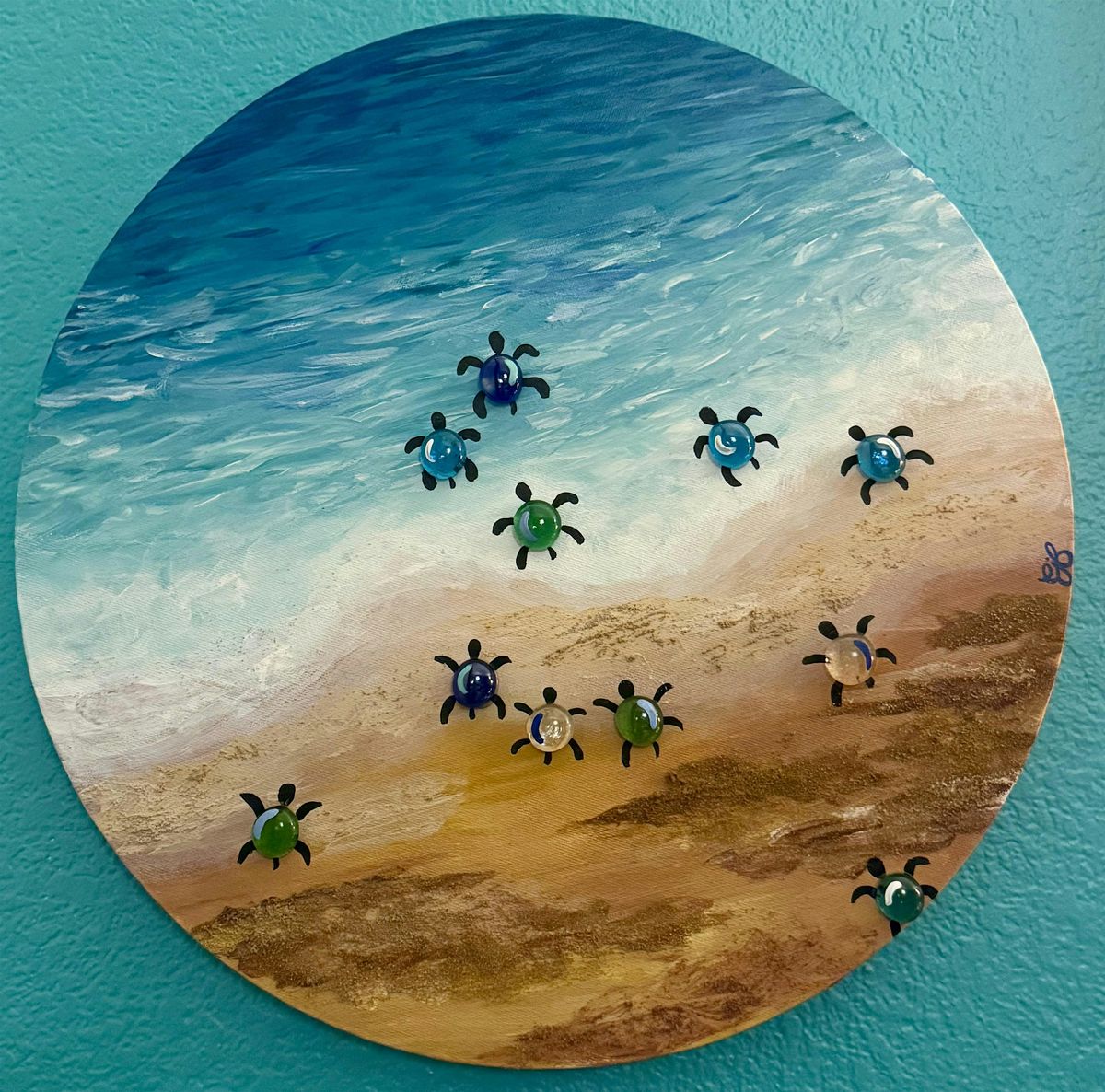 Sea Turtles mixed media round canvas painting at Wild Blue Yonder
