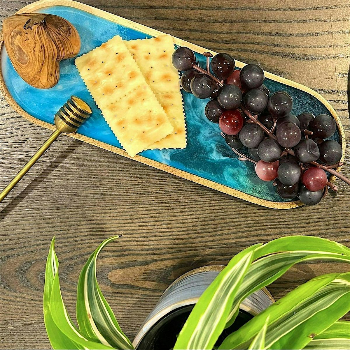 In this tactile workshop, we will be discussing the ins and outs of resin art and create an eye-catching and functional serving tray. Under the guidance of your artist host, you will decorate an Acacia wood tray with resin, add color, and work in 'sea wave' swirls. This piece will be a conversation starter and work as a unique serving tray for charcuterie or other snacks. It also makes a perfect a gift, or simply something cool to display around the house.