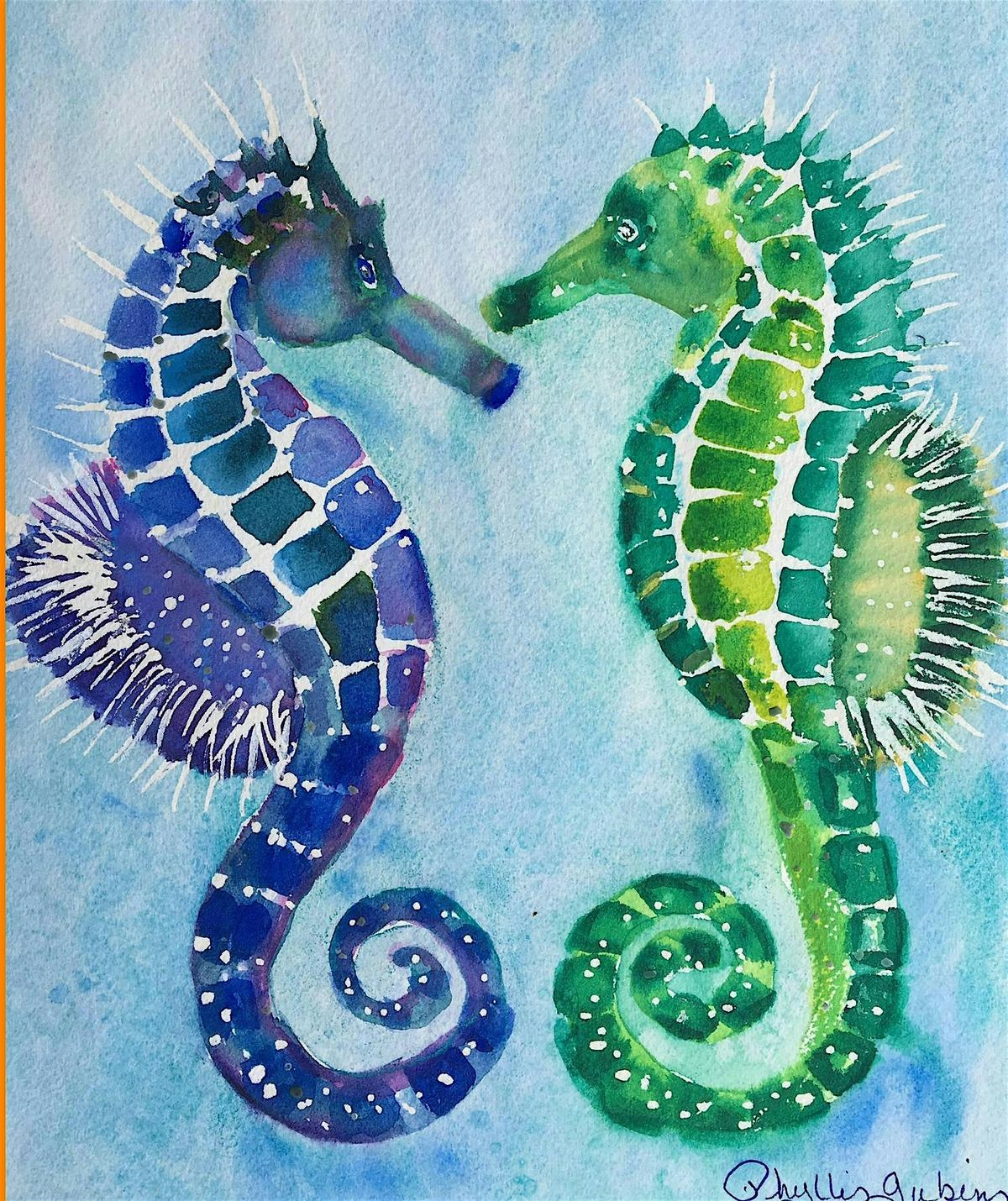 Dive into the graceful beauty of the sea in this watercolor seahorse painting workshop with Phyllis Gubins. Known for her gentle guidance and encouraging teaching style, Phyllis will lead you step-by-step as you create a vibrant, flowing seahorse full of movement, color, and ocean charm.
