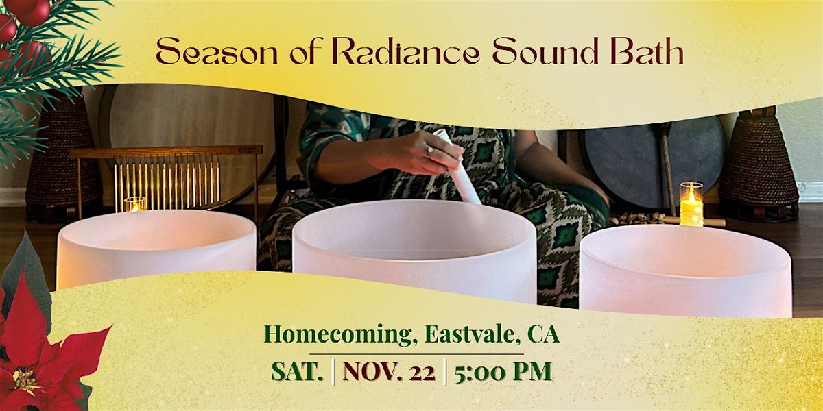 Welcome to a Season of Radiance Sound Bath at Homecoming at Eastvale! A serene and luminous holiday sound bath designed to help you release tension, awaken your inner radiance, and restore peace during the start of the holiday season. Join us for a soothing evening of immersion in the sounds of chimes, rain stick, crystal singing bowls, gong and guided intention work. Step into a sanctuary of calm, healing, and radiant energy as we transition into the holiday season. This restorative sound bath is designed to help you release emotional heaviness, reset your nervous system, and reconnect to your inner glow.