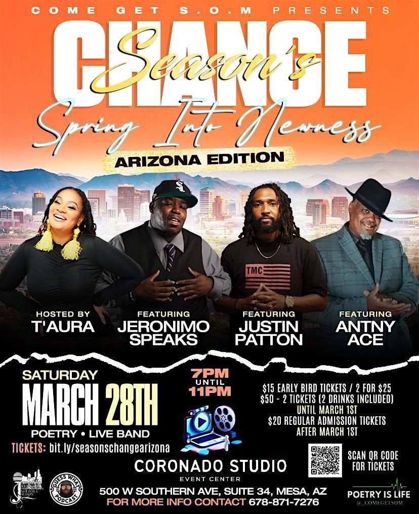 Curated by Come Get S.O.M, this isn’t just another poetry show — it’s a creative takeover. Expect powerful poetry, curated sounds, and feel-good music setting the tone all night at Coronado Studio Event Center in Mesa, Arizona. Season's Change and so do we, get ready to hear some spitting bars, sharing stories, singing hooks - going back down memory lane (we will test your music knowledge) it'll be fun or vibing in the crowd, this is the place to be.