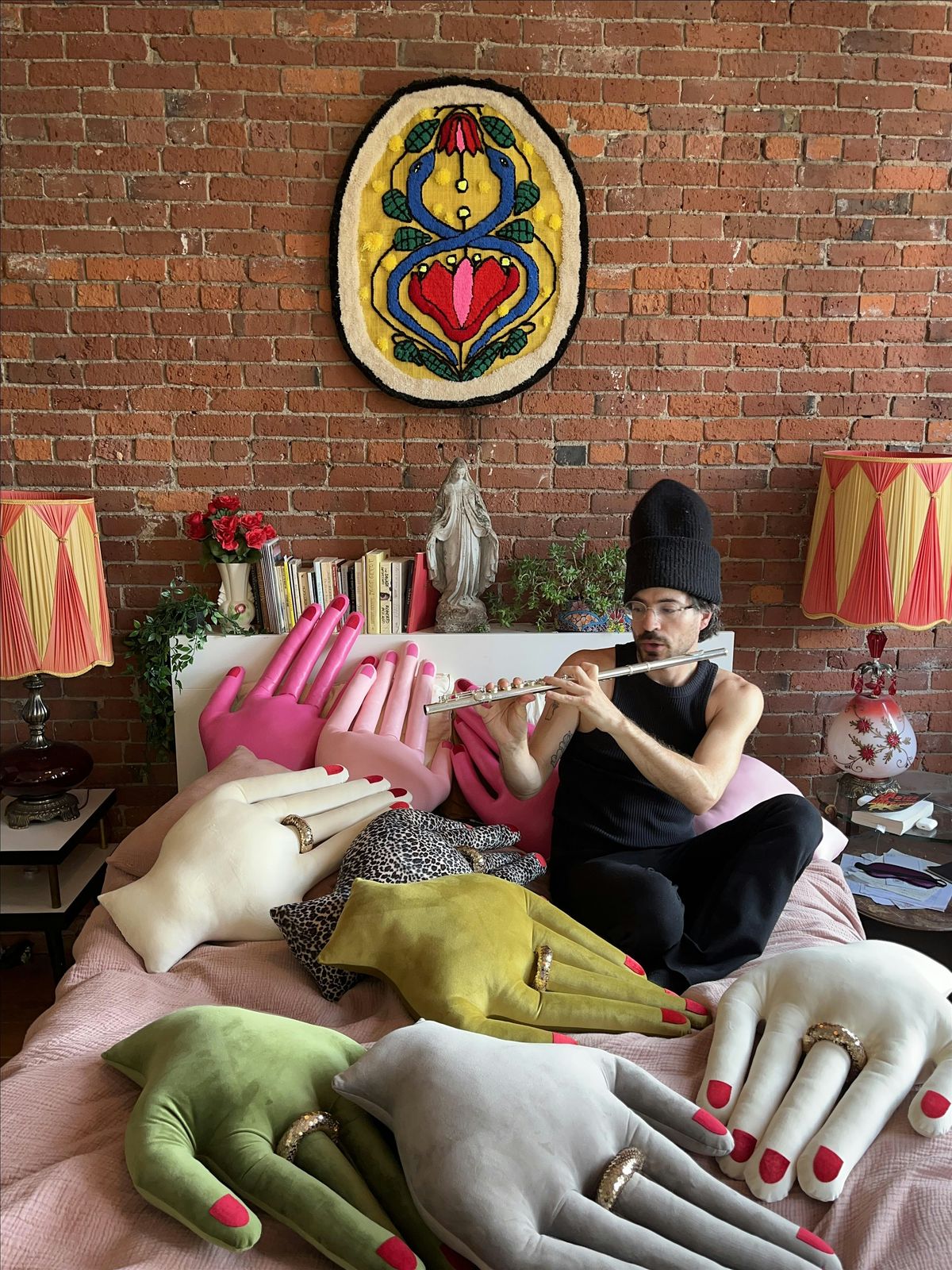 Who is Mikey McKinney? Mikey is a Seattle-based artist whose work is rooted in social and political dissidence through the avant-garde and the absurd. A graduate of the Art Institute of New York, he's toured the country with musical projects, created art for social justice organizations, and built Haus of Hands into a beloved soft sculpture and textile practice, entirely by hand, with a Singer sewing machine, using vintage estate sale finds, MOOD fashion fabric, and yes, grandma fabric from Joann. His work has been featured in The Seattle Times, The Stranger, KEXP, and Dwell Magazine. He is currently learning to play the flute.