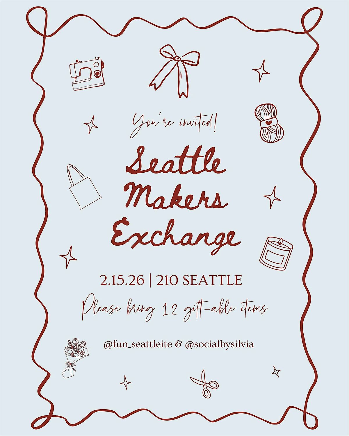 Welcome to the Seattle Maker Exchange! Join us at 210 seattle for a community-driven trading event where friends, creatives, and local makers come together to exchange homemade food, art, plants, and handcrafted goods. It’s designed to be a relaxed, social space where people can connect, support one another’s creativity, and leave with something meaningful — whether it’s a new favorite snack, a piece of art, or a new friend.