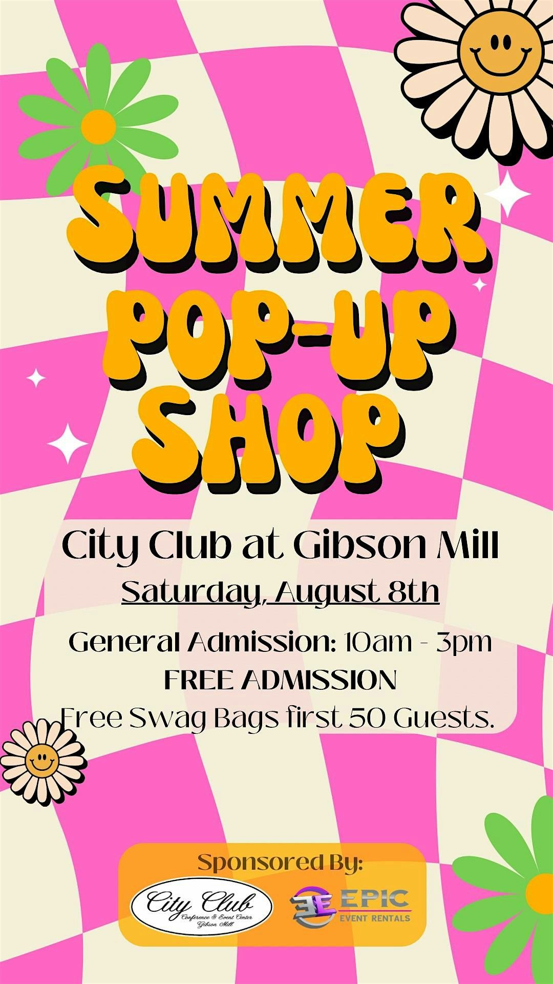 Welcome to the Second Annual Summer Pop-Up Shop! Join us on Sat, Aug 8, 2024 at 10:00 AM at the City Club at Gibson Mill for a day of shopping, music, and fun!