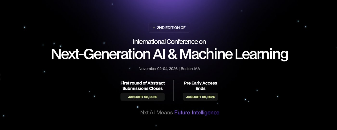 Nxt AI-2026 is the second edition of the International Conference on Next-Generation AI & Machine Learning, scheduled for November 2–4, 2026, in Boston, Massachusetts. The conference serves as a global platform for researchers, industry experts, and technology leaders to exchange ideas, present original research, and discuss advancements shaping the future of artificial intelligence.