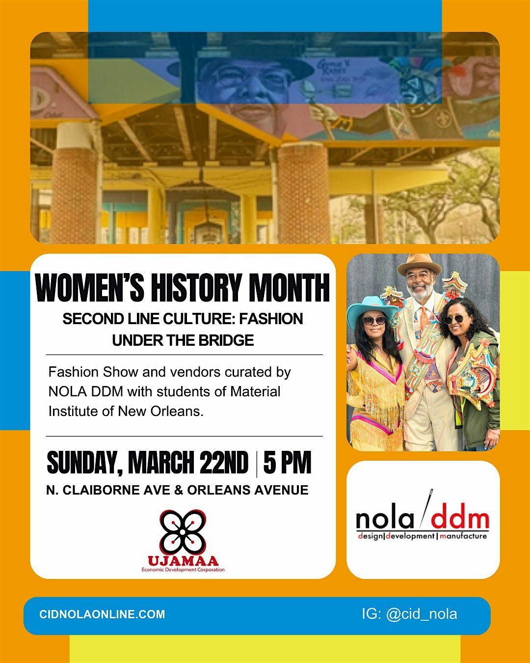 On Sunday, March 22, 2026: We're celebrating Women’s History Month with an Exhibition - “Second Line Culture: Fashion Show Under the Bridge” curated by NOLA DDM with students of Material Institute of New Orleans.