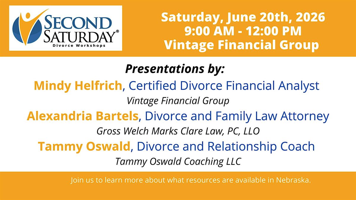 Second Saturday offers non-biased financial, emotional and legal advice from qualified local professionals, providing people with the knowledge, support, resources and trust that they need to survive the divorce process and move forward with confidence toward a new life.