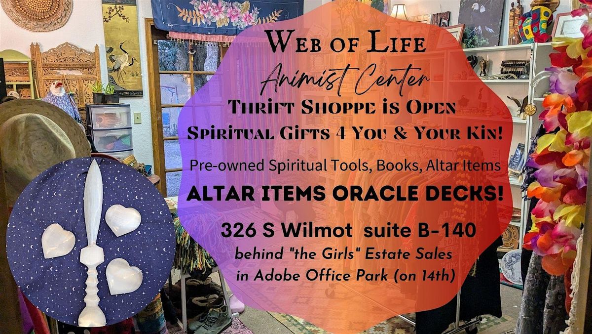 Tucson! Our thrift and gift shoppe is open today from 1-3 pm with many newly arrived tools and unique clothing items hand-picked by Quynn for your soul/spiritual life. Journals, altar cloths, stones, spiritual tool bags, tapestries, oracle decks, art, and unique altar items await. Many oracle decks have been donated and are for sale!