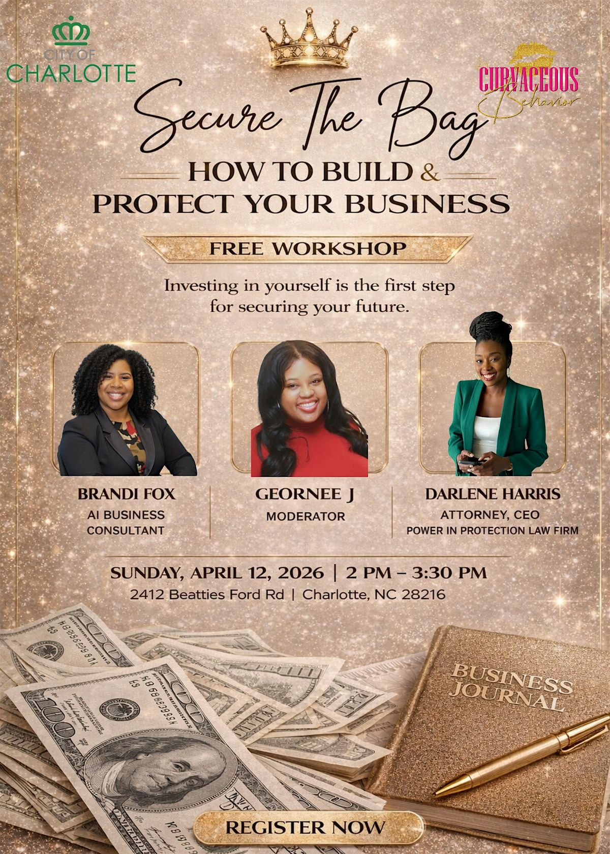 Join us for Secure the Bag: Legal & Financial Power Moves for Entrepreneurs, an empowering workshop designed to help entrepreneurs, creatives, and small business owners protect their brand, understand the legal side of business, and position themselves for long-term success.