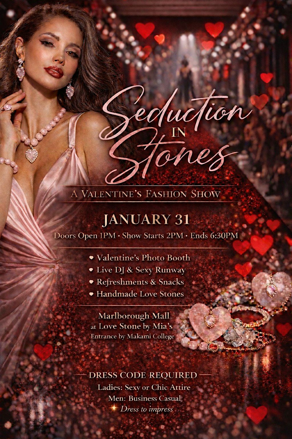 Welcome to Seduction in Stones, A Valentine’s Fashion Show! Join us at Marlborough Mall at Love Stone by Mia’s Entrance by Makami Colle on January 31, 2026 at 1:00 PM (Mountain Time) for an unforgettable experience.