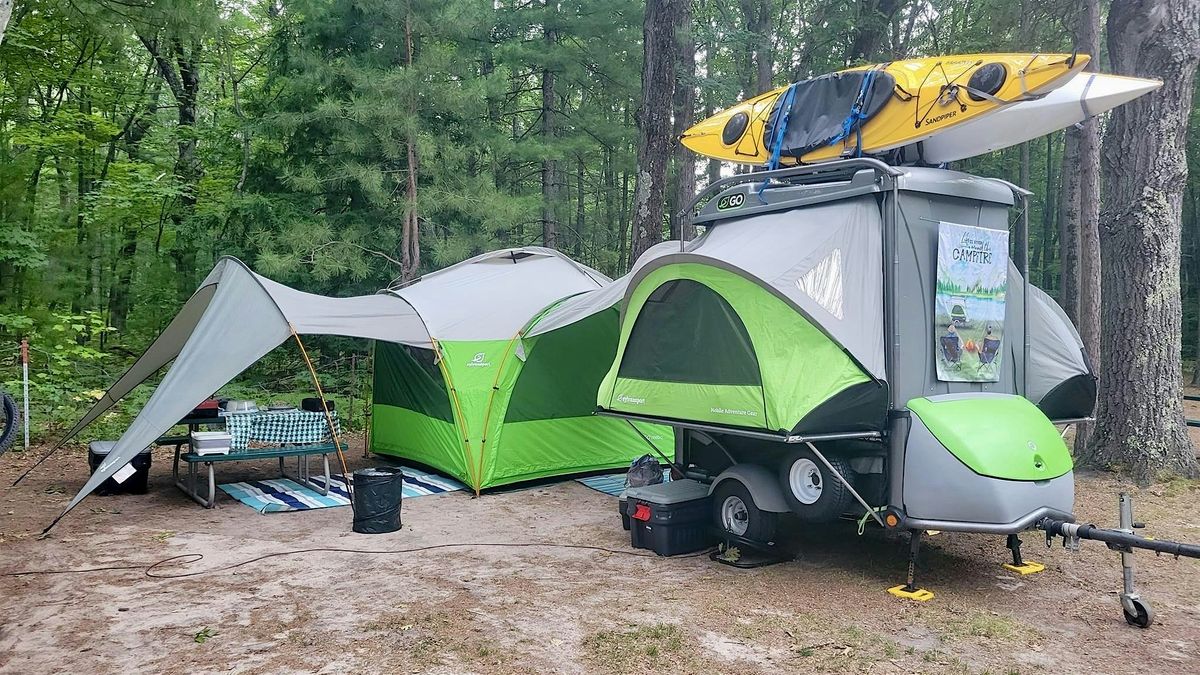 Weighing just 840 lbs, the GO can be towed by almost any vehicle, including many smaller SUVs, hybrids, and EVs. It offers a surprisingly spacious interior for sleeping and hanging out, plus robust gear‑hauling capabilities so you can bring bikes, kayaks, and more along for the ride. Stop by to see it in person and picture your next adventure.