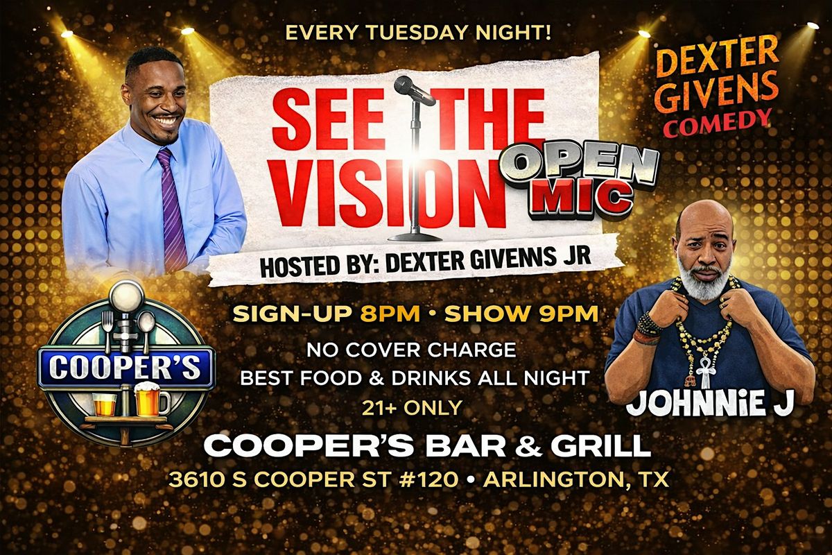 See The Vision Open Mic every Tuesday at Cooper’s Bar & Grill! Sign-up 8 PM, show 9 PM. Hosted by Dexter Givens Jr. Food & drinks all night