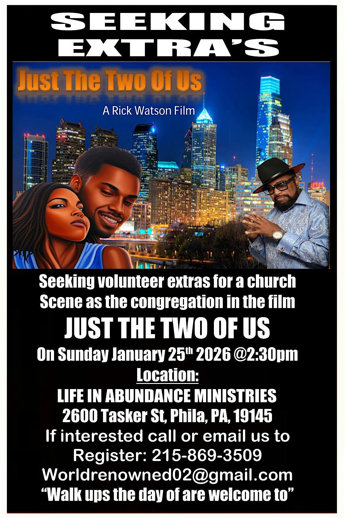 We are seeking Volunteer extras for a church scene as the congregation, all are welcome.
