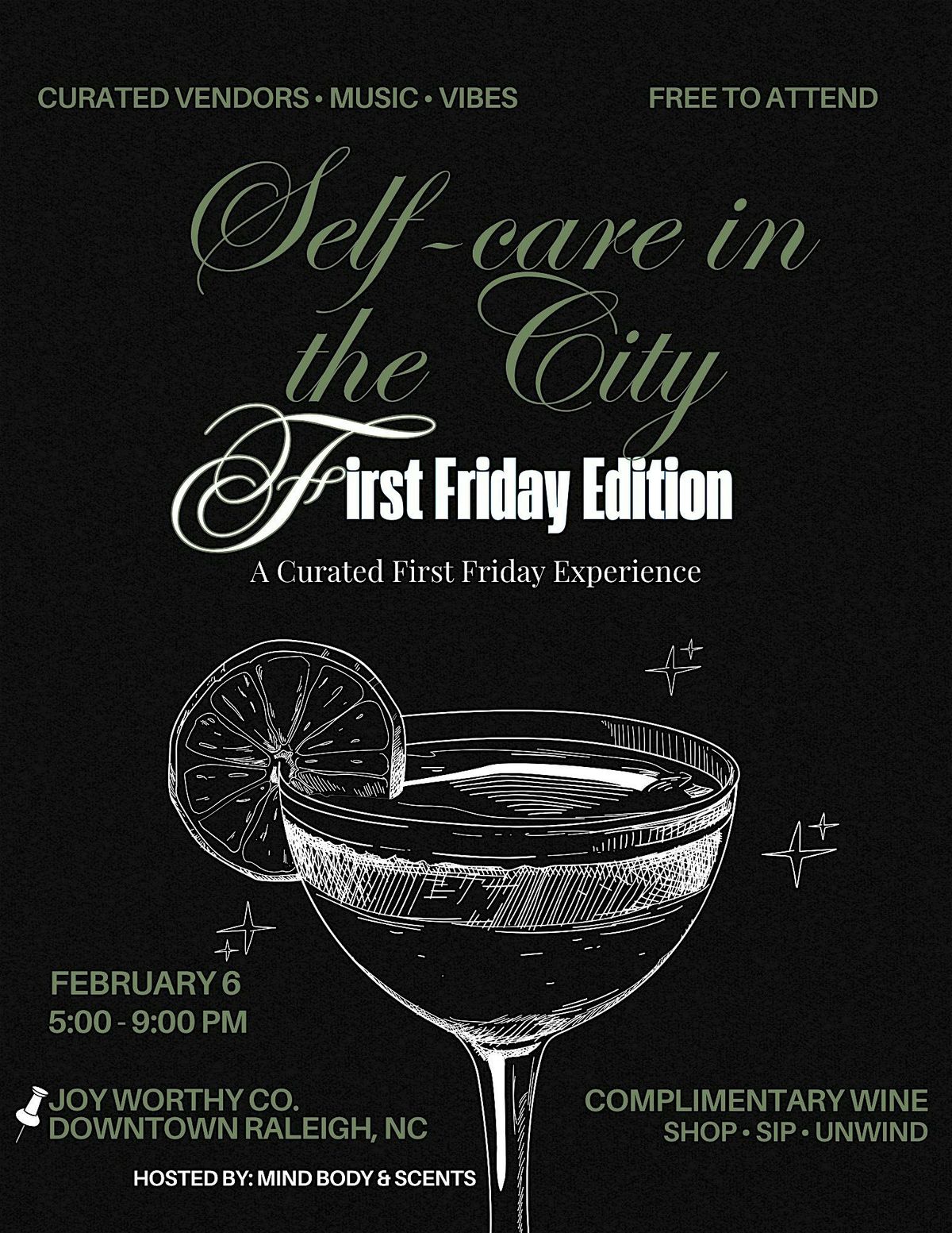 Self-Care in the City is a curated First Friday experience bringing together thoughtfully selected vendors focused on self-care, lifestyle, and elevated everyday pleasures. Sip complimentary wine as you explore candles, body care, jewelry, style, and sweet treats—all set to music and good vibes.