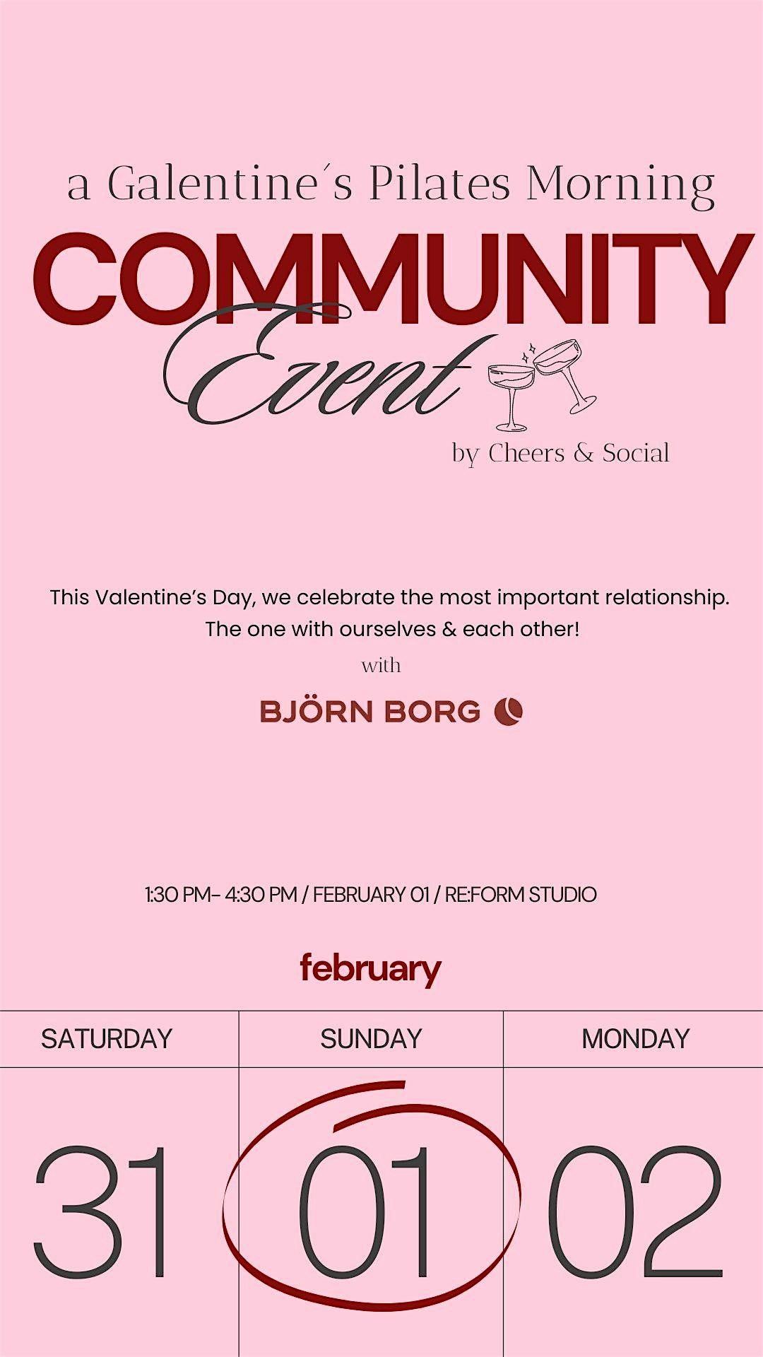 Passend zum Valentinstag feiern wir am 01.02 einen ganz besonderen Galentine’s Day, der ganz im Zeichen von Girlhood, Selflove und Zusammenhalt steht. Wir starten gemeinsam mit einer stärkenden Fullbody Reformer Pilates Class in den Morgen – begleitet von liebevoll kuratierten Aktivitäten, ausgewähltem Food & Drinks sowie Goodies und Sportprodukten aus der neuen Kollektion von Björn Borg und weiteren Partnern (im Wert von über 150€).