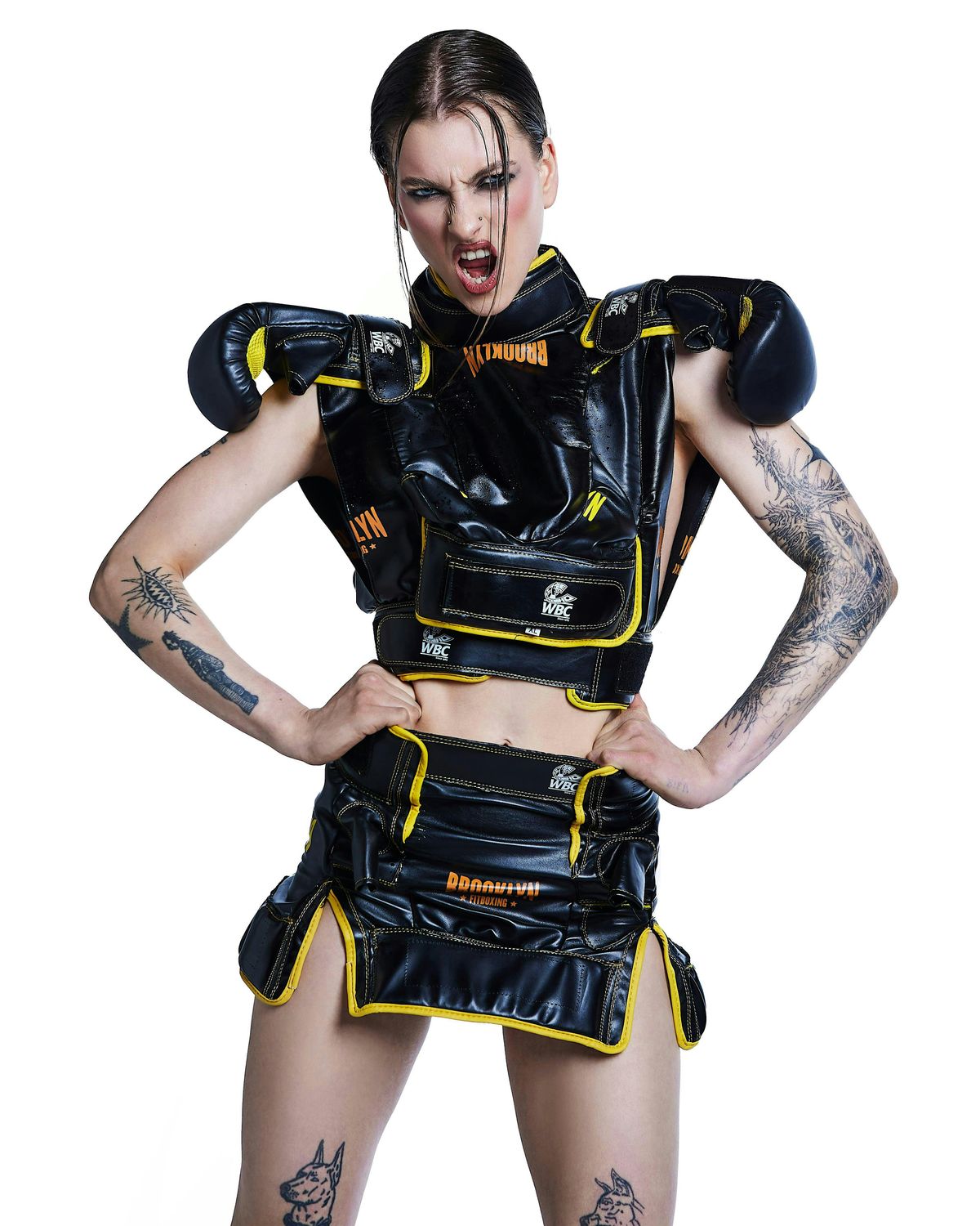 Through this collaboration, discarded boxing gloves, hand wraps, training equipment, and lost-and-found items from Brooklyn Fitboxing studios across Berlin have been transformed into striking fashion pieces by SELVA HUYGENS.