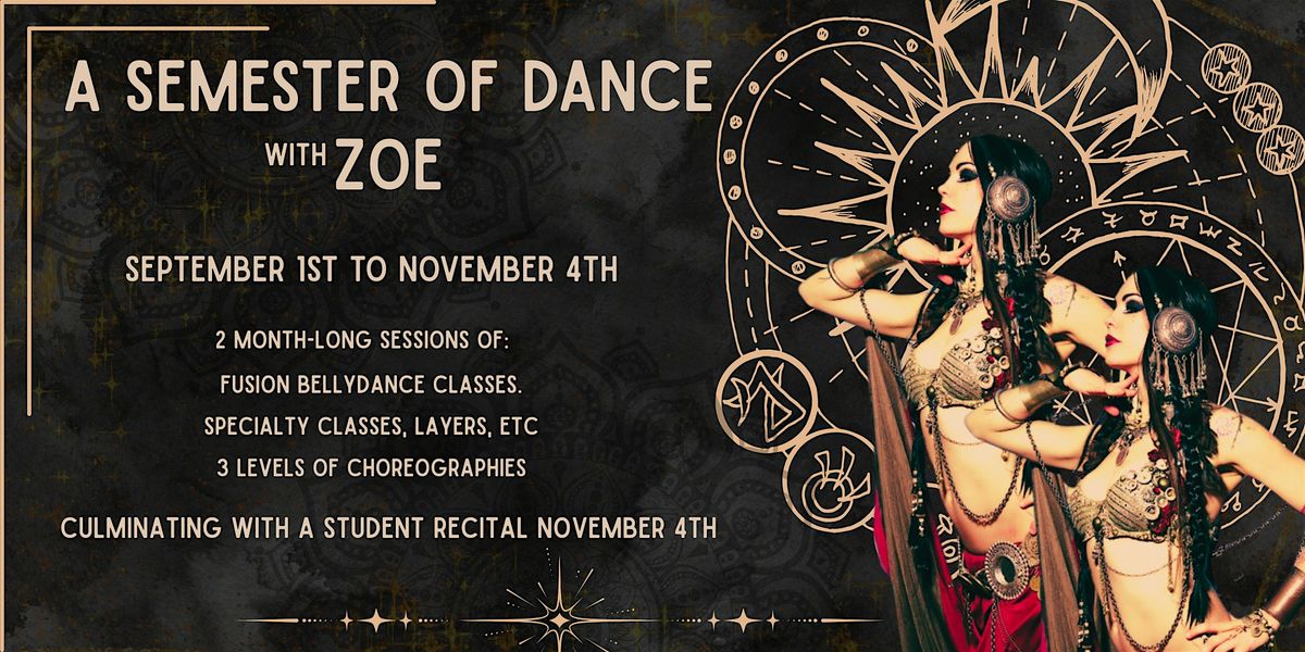 2-month long sessions of Fusion Bellydance with Zoe! Courses in dance are happening weekly from September to November (NO CLASS OCT 19th AND 20th). Classes are in person and online (choreography classes require in-person 2 out of 4 classes). This fall semester culminates in a school recital in Oakland, California, where students will be performing the group choreographies on November 4th.