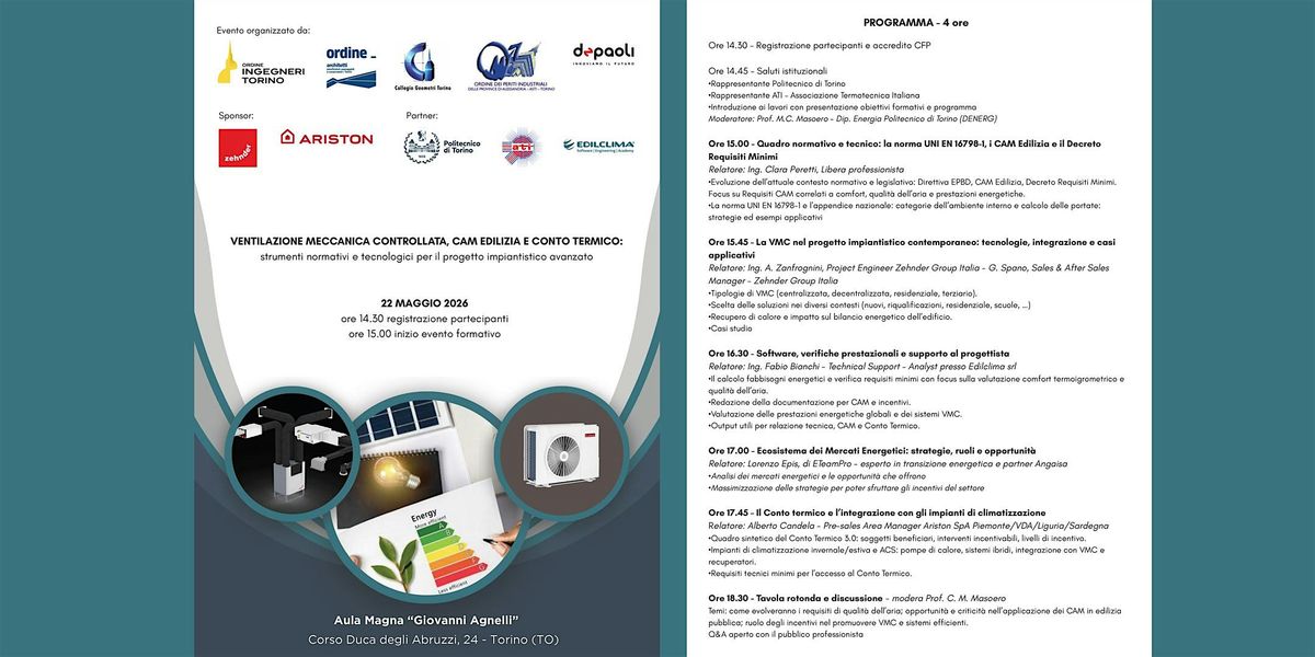 Info: Temi: come evolveranno i requisiti di qualità dell’aria; opportunità e criticità nell’applicazione dei CAM in edilizia pubblica; ruolo degli incentivi nel promuovere VMC e sistemi efficienti.