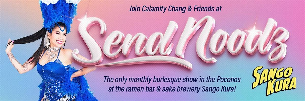Calamity Chang, NYC-made (now based between the Poconos and the Lehigh Valley), is bringing burlesque to the Poconos at Delaware Water Gap’s beloved sake brewery, Sango Kura. Now in its 5th year, Send Noodz keeps selling out thanks to your support and has built a playful, fun-loving community that comes hungry for laughs, glamour, and a little trouble (the good kind).