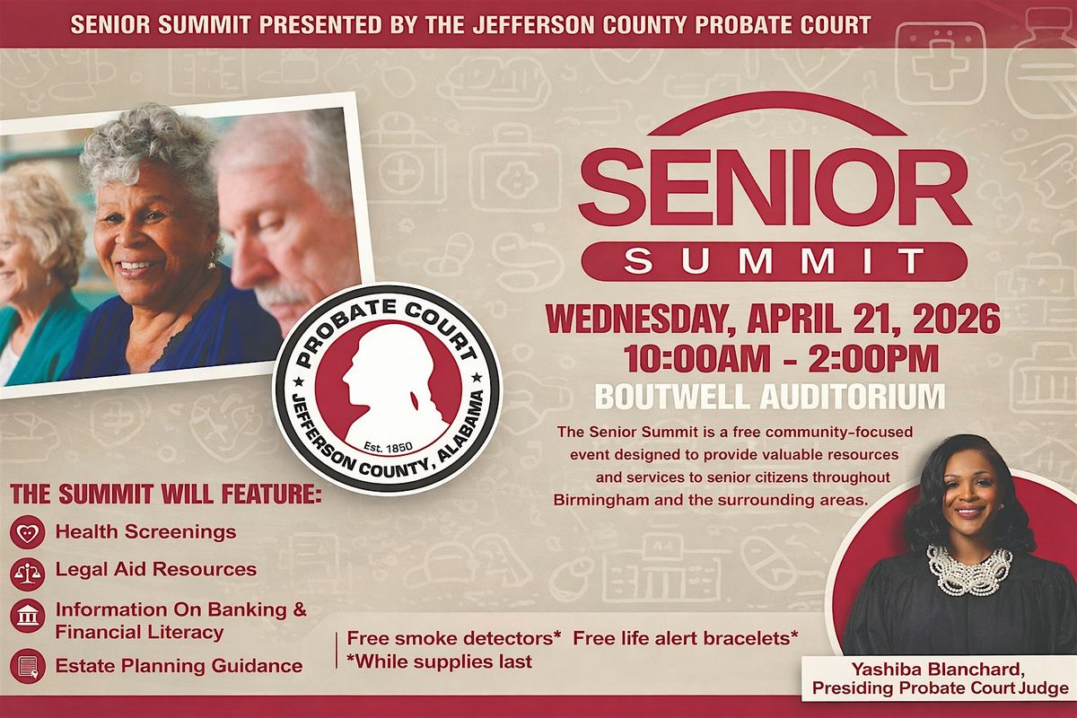Join the Jefferson County Probate Court for our Senior Summit, a community-focused event designed to inform, empower, and support our senior residents and their families. This summit will provide valuable resources, expert insights, and practical tools to help seniors navigate important topics such as estate planning, health and wellness, safety and voter services and more.