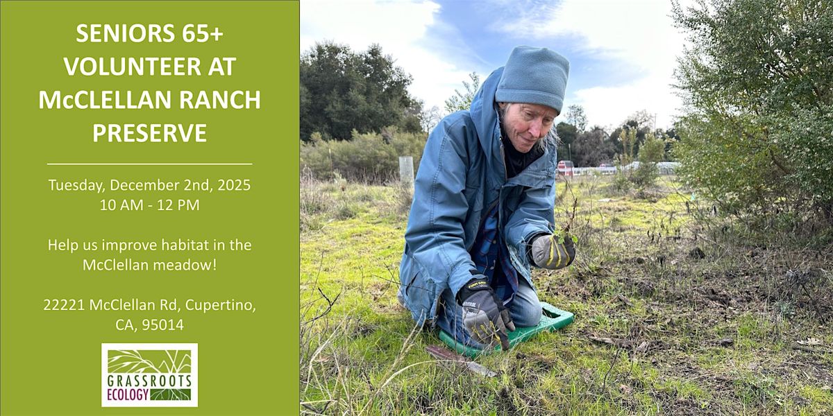 Seniors age 65 and older: join Grassroots Ecology in our ongoing restoration of the meadow at McClellan Ranch Preserve in Cupertino! We will spend our time together weeding and pruning plants to prepare for the winter. Volunteers should expect to walk along flat ground on paved and unpaved surfaces, kneel or sit on kneeling pads, and use hand tools. Stay for as long or short as you would like!