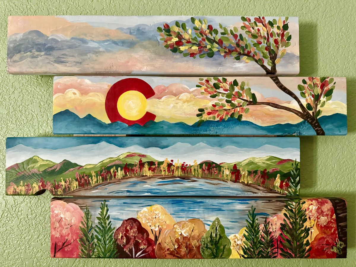 Come join us for a relaxing evening of creativity and fun! Let your inner artist shine as you paint this lovely Colorado landscape! Choose from a 14"x20" staggered wood canvas for $55 or a 16"x20" white canvas for $45. *The demo painting was done on wood!
