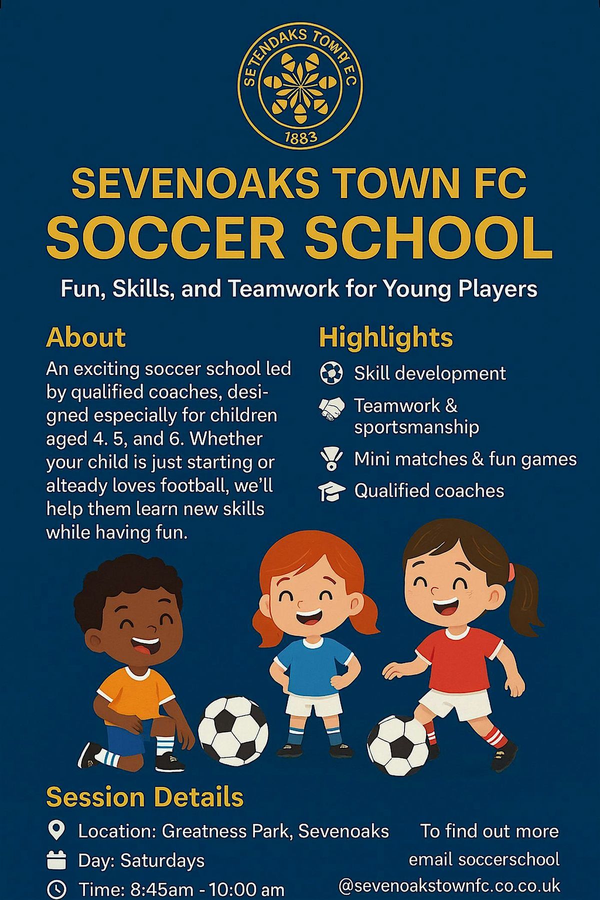 Soccer School for boys and girls aged 4,5 and 6 years old and an all girls section for ages 7 to 10 year olds