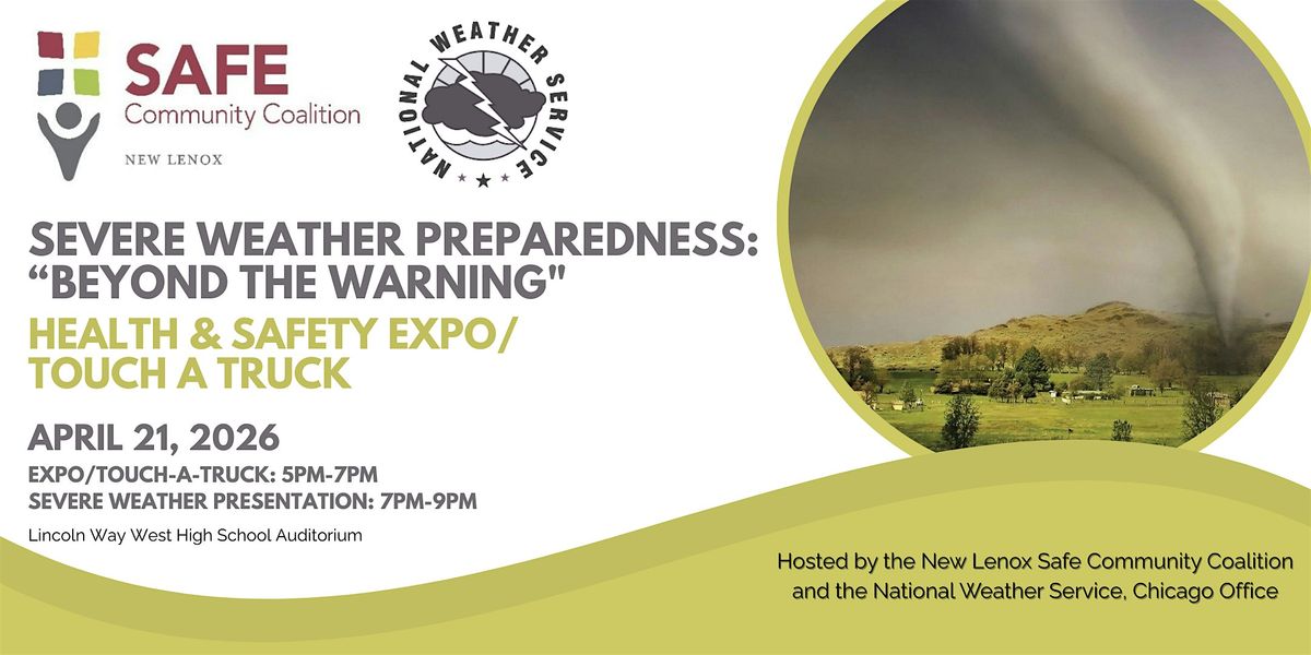 Join us on Tuesday, April 21, 2026, at Lincoln-Way West High School, (21701 Gougar Road New Lenox, IL 60451) for a special, BRAND NEW presentation from the National Weather Service, as well as our Health & Safety Expo/Touch-A-Truck event!