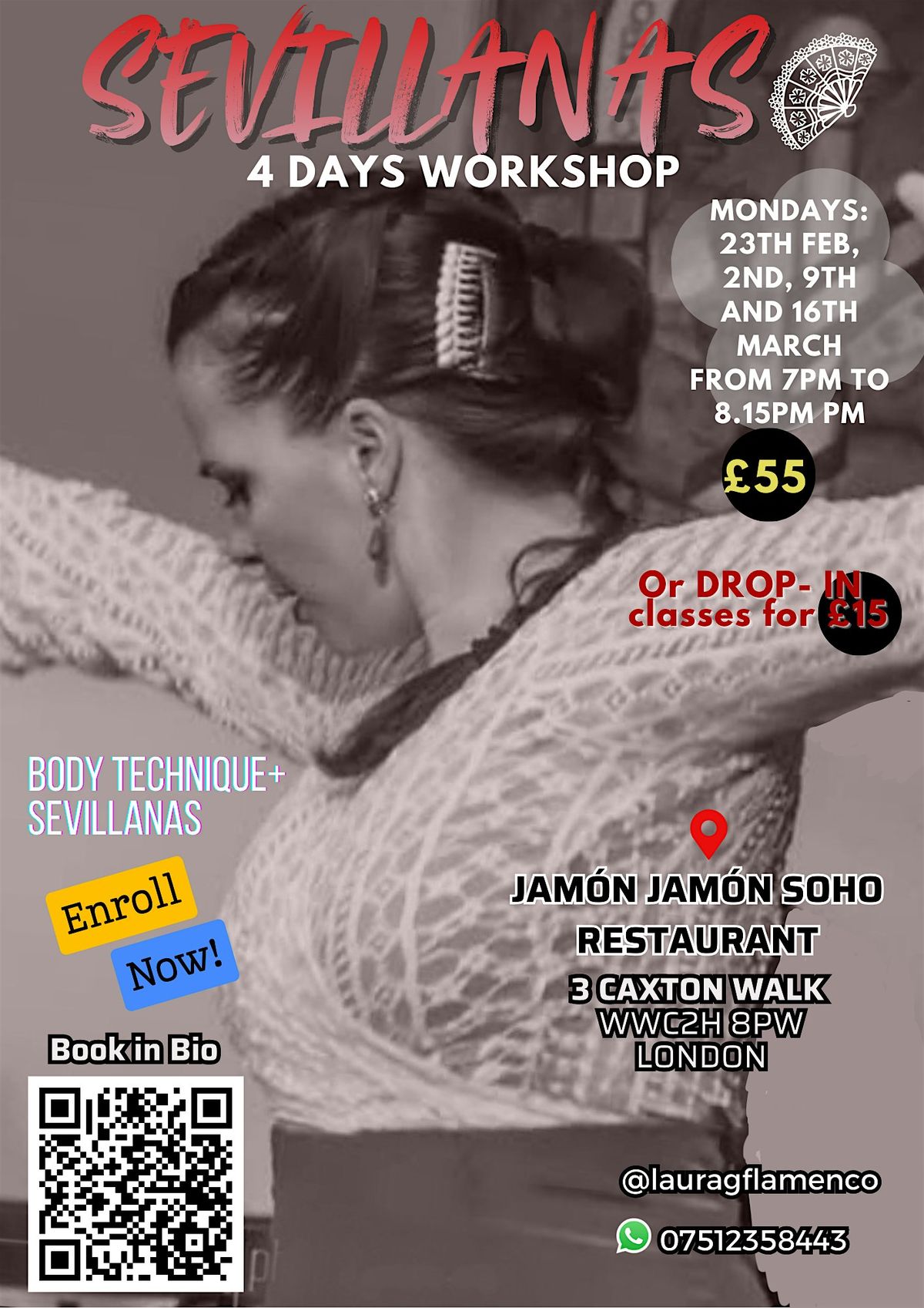 Learn body technique, rhythms and steps of traditional Sevillanas with our professional instructor Laura González!