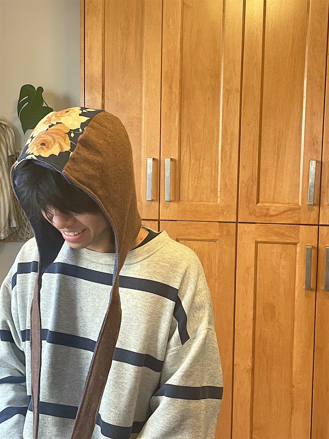 - As this is a reversible project there is an opportunity to design this bonnet to be uniquely your own! For example as pictured below, for one side of the reversible bonnet I have chosen a combination of dark blue fabic for the matching left & right panels, and then a scrap piece of striped fabric I had for the top panel. If you don't have scraps to bring and or don't want to purchase 4 different fabrics, making a solid colour bonnet is just as cool!