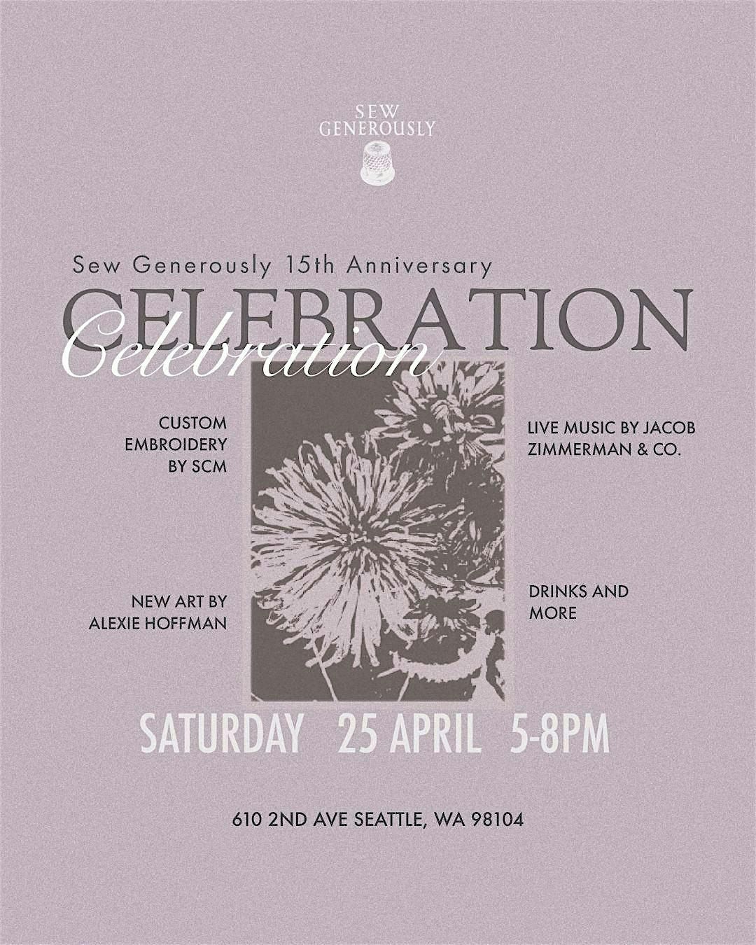 We'll have live music by Jacob Zimmerman & Co., a new art gallery from Alexie Hoffman, custom embroidery by Seattle Chainstitch, drinks, and more. We hope to see you there!