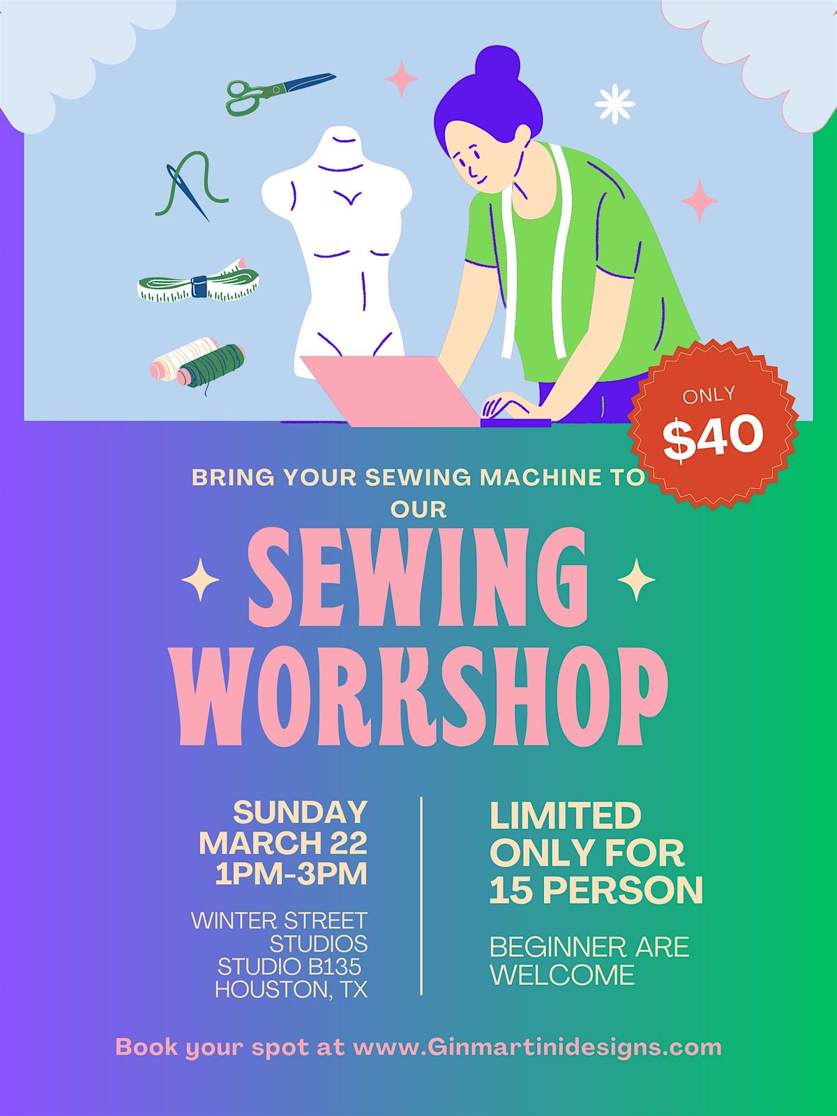 Welcome Spring with your sewing machine! Dust it off or finally get that box open and bring your sewing Machine out to WInter Street studios to brush up on your techniques. This Class will be led by Gin Martini Of GinMartiniDesigns.com. We will be making a mini Tote bag with Floral and pastel themes. The Fabric will be provided and be cut to the shapes already. We will be mostly be sewing. You will need to bring your sewing machine, thread and little scissors. Light drinks and snack will be provided but you are welcome to BYOB.