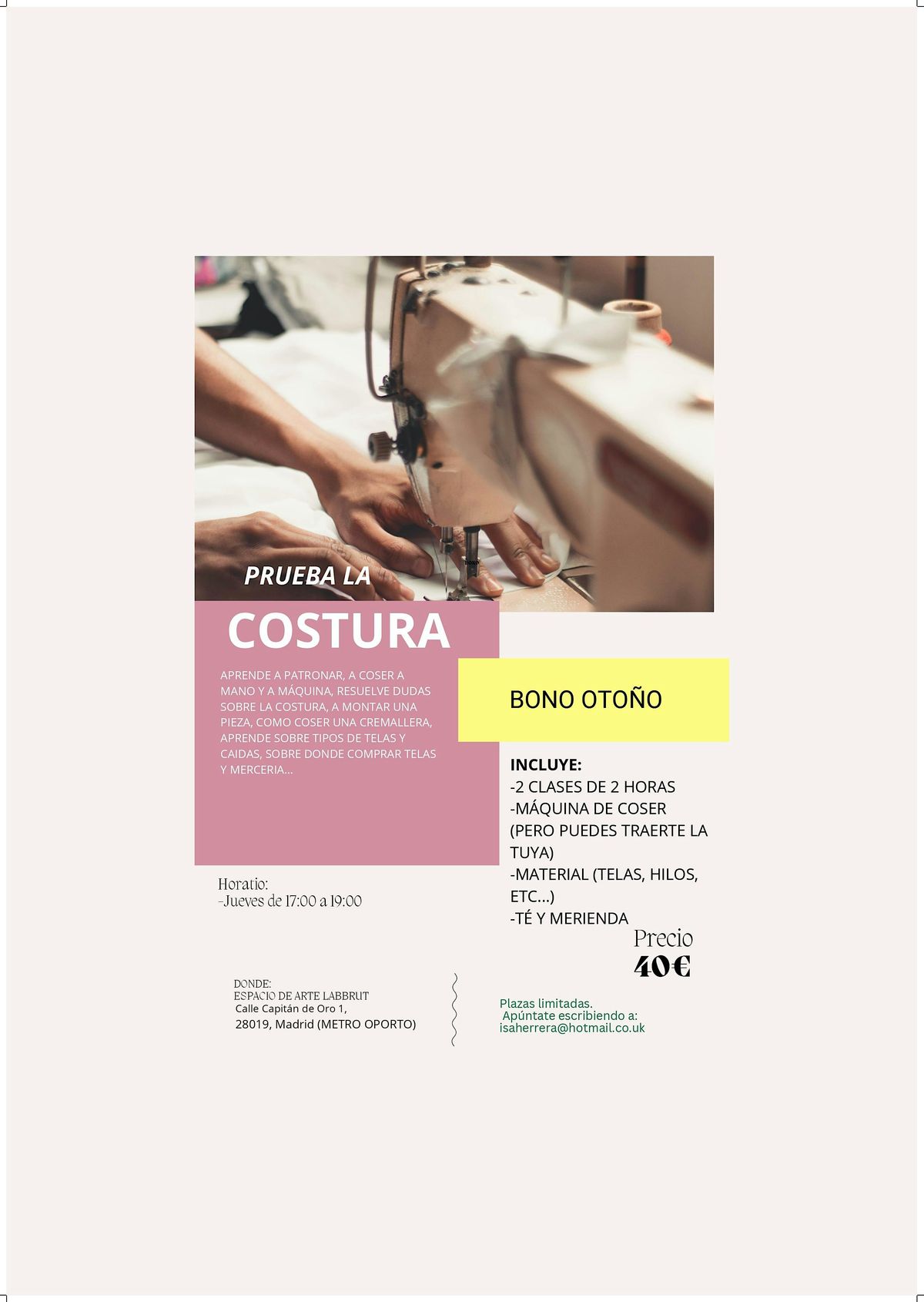 ¡No te pierdas esta divertida oportunidad de aprender una nueva habilidad mientras te diviertes con otros amantes de la costura!