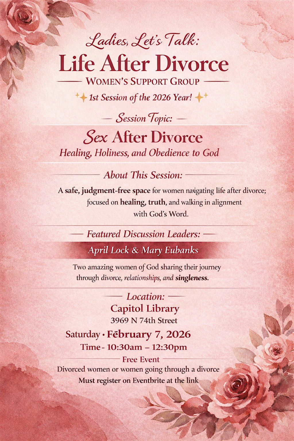 Come join us in a safe non-judgmental space with other sisters navigating life after Divorce. Get ready! Let’s talk! Saturday, 2/7/26.