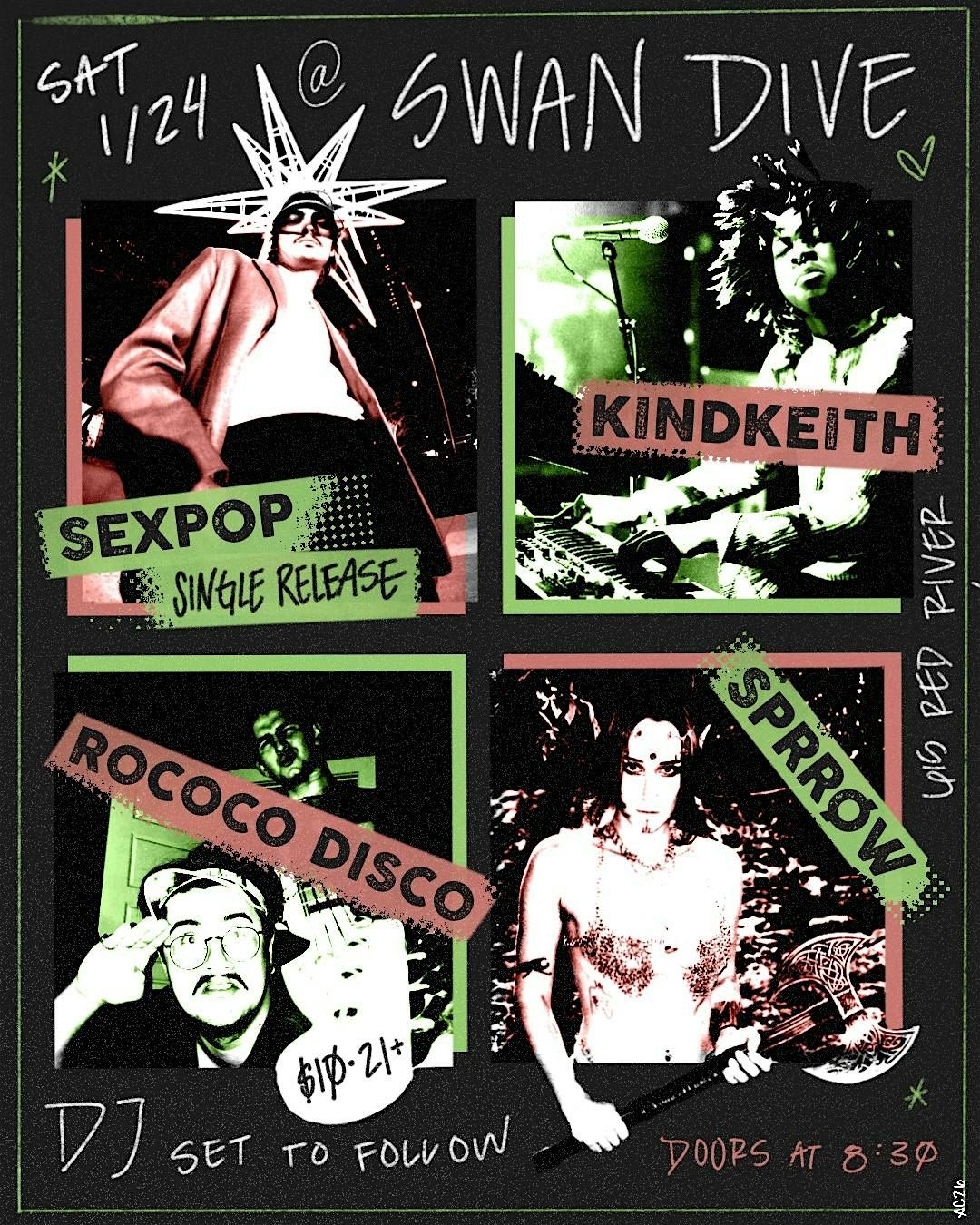 SEXPOP is taking over Swan Dive for the release of their new single "Revelations" with their friends Kind Keith, SPRRØW, & Rococo Disco!! A night of furious pop-driven funk, soul, dance, techno, and so much more at Swan Dive!! Doors at 8:30 and music at 9, only $10 to get you in the door, you shouldn't be anywhere else. Join us on January 24th for SEXPOP's single release, you won't want to miss it.